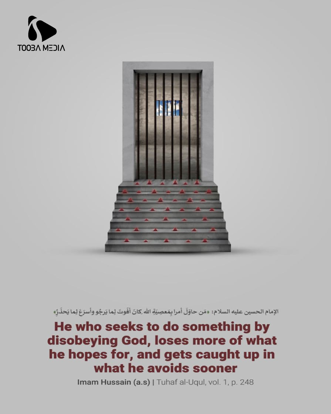 Imam Hossein (a.s) Said: He who seeks to do something by disobeying god, loses more of what he hopes for, and gets caught up in what he avoids sooner. Tuhaf al-Uqul-vol1 p248