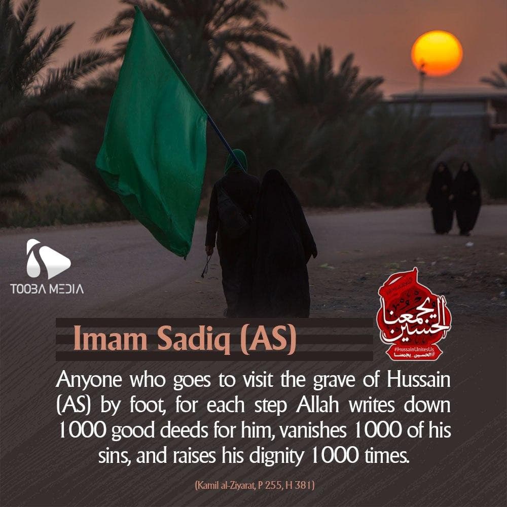 Imam Sadiq (a.s): Anyone who goes to visit the grave of Hussain (A.S) by foot, for each step Allah writes down 1000 good deeds for him.