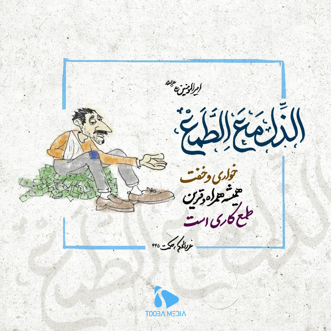 امیرالمومنین علی علیه السلام می فرمایند: خواری و خفّت همیشه همراه و قرین طمع کاری است. غررالحکم-حکمت 445
