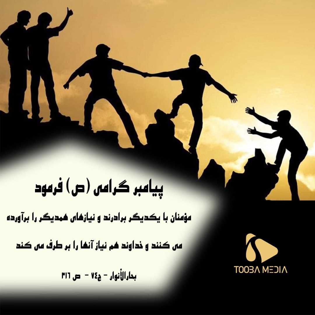 پیامبر گرامی (ص) فرمود: مؤمنان با يكديگر برادرند و نيازهاى همديگر را برآورده مى كنند و خداوند هم نياز آنها را بر طرف مى كند بحارالأنوار – ج74 – ص 316