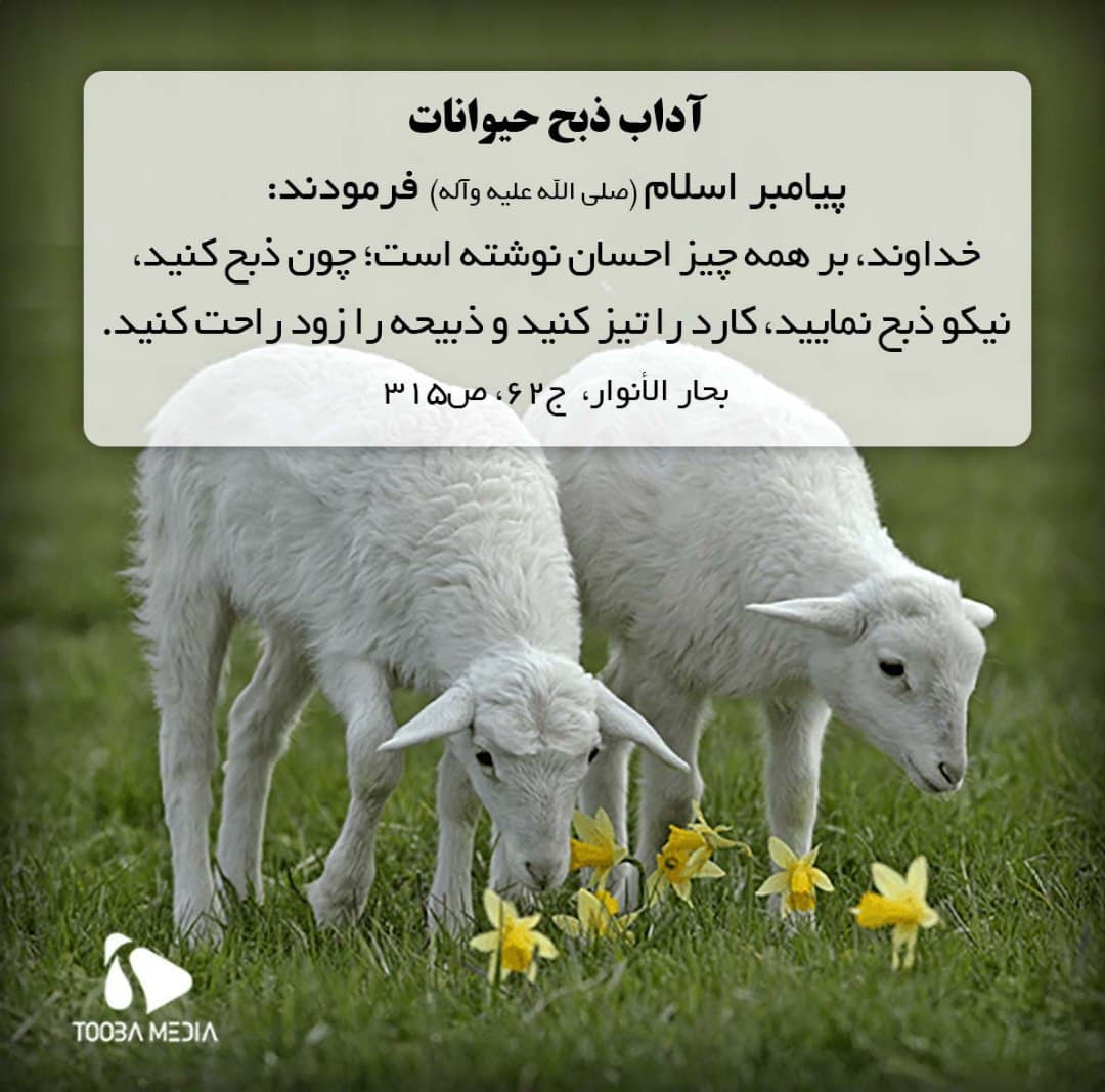 پيامبر اسلام (صلى الله عليه وآله) فرمودند: خداوند، بر همه چيز احسان نوشته است؛ چون ذبح كنيد، نيكو ذبح نماييد، كارد را تيز كنيد و ذبيحه را زود راحت كنيد. بحار الأنوار ج۶۲ ص۳۱۵