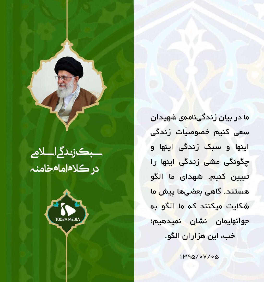 سبک زندگی اسلامی در کلام امام خامنه ای 3) ما در بیان زندگی‌نامه‌ی شهیدان سعی کنیم خصوصیّات زندگی اینها و سبک زندگی اینها و چگونگی مشی زندگی اینها را تبیین کنیم. شهدای ما الگو هستند. گاهی بعضی‌ها پیش ما شکایت میکنند که ما الگو به جوانهایمان نشان نمیدهیم؛ خب، این هزاران الگو ۱۳۹۵/۰۷/۰۵