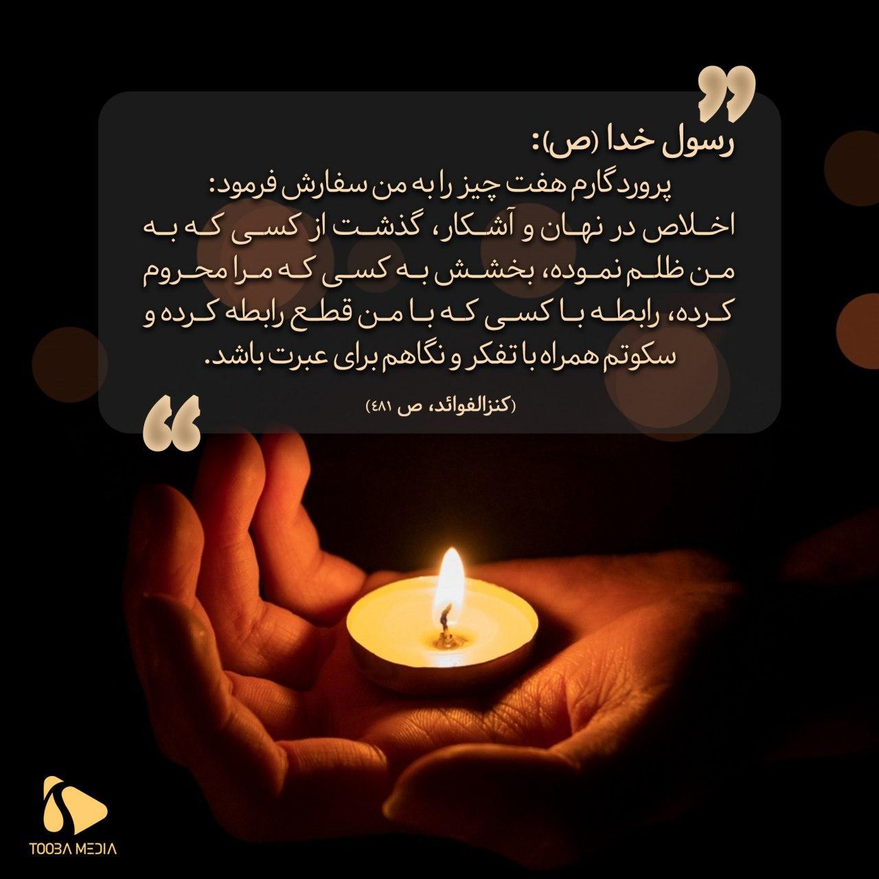 رسول خدا (ص): پروردگارم هفت چیز را به من سفارش فرمود: اخلاص در نهان و آشکار، گذشت از کسی که به من ظلم نموده، بخشش به کسی که مرا محروم کرده، رابطه با کسی که با من قطع رابطه کرده و سکوتم همراه با تفکر و نگاهم برای عبرت باشد.