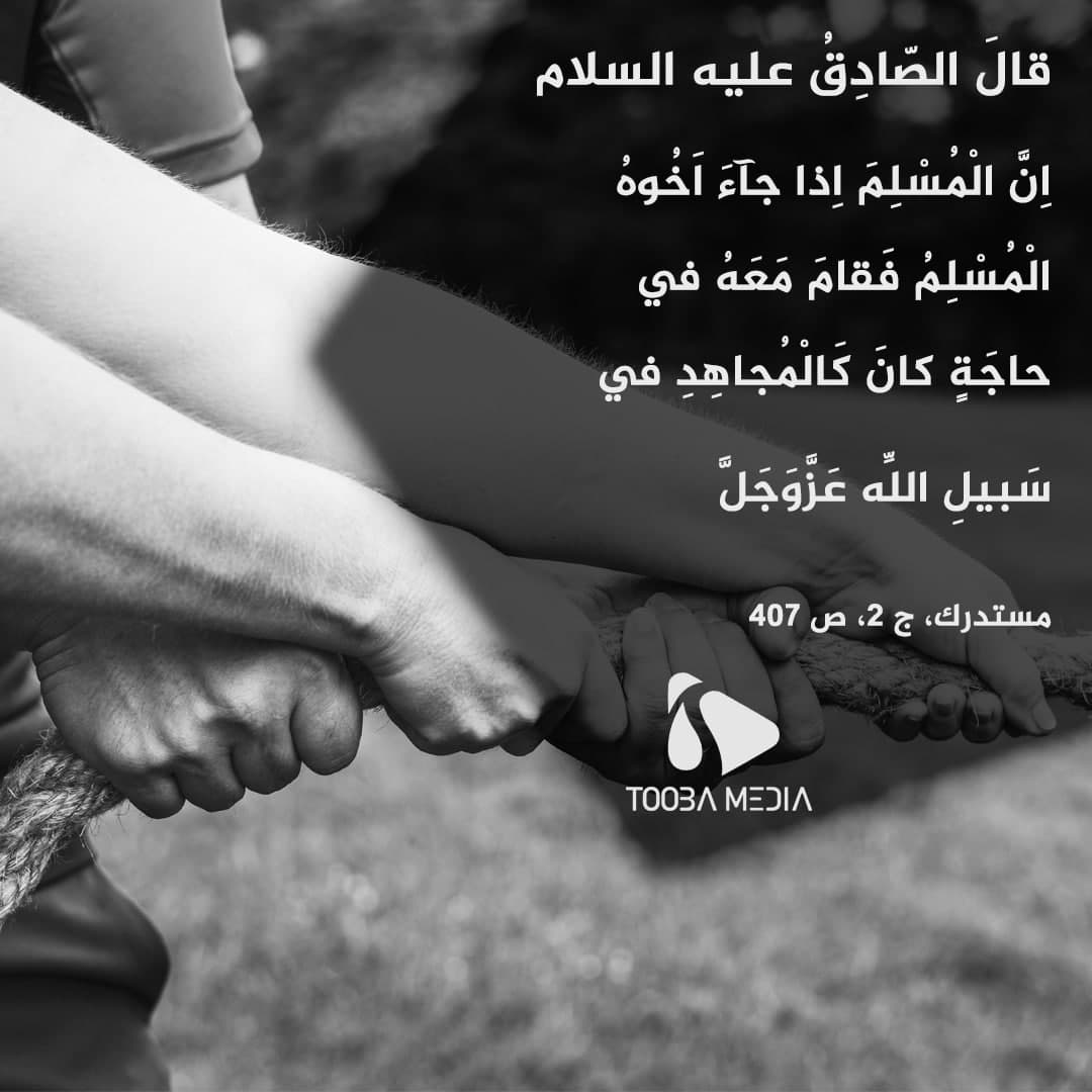 قالَ الصّادِقُ عليه السلام: اِنَّ الْمُسْلِمَ اِذا جآءَ اَخُوهُ الْمُسْلِمُ فَقامَ مَعَهُ فِى حاجَةٍ كانَ كَالْمُجاهِدِ فِى سَبيلِ اللّهِ عَزَّوَجَلَّ. مستدرك، ج 2، ص 407