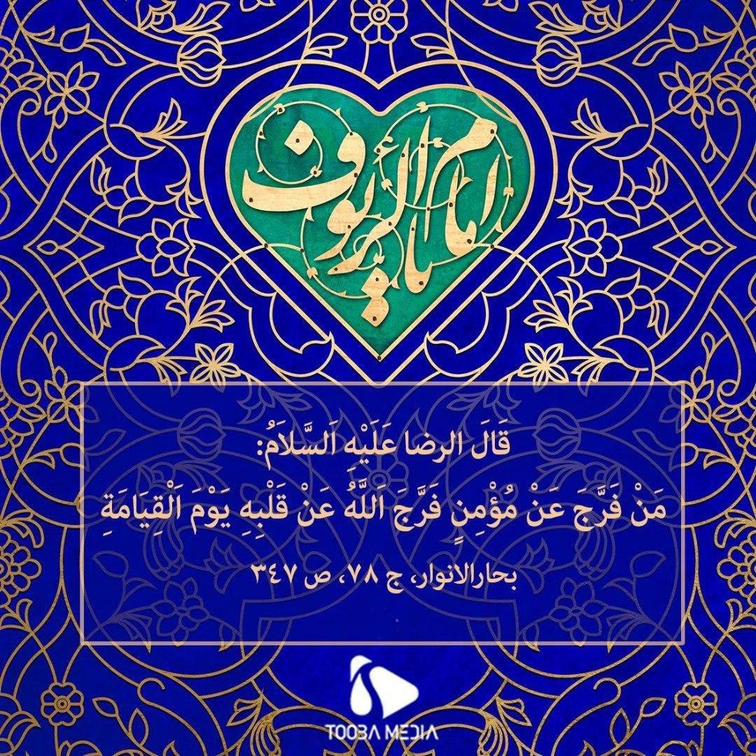 قَالَ الرضا عَلَیْهِ اَلسَّلاَمُ: مَنْ فَرَّجَ عَنْ مُؤْمِنٍ فَرَّجَ اَللَّهُ عَنْ قَلْبِهِ يَوْمَ اَلْقِيَامَةِ بحارالانوار، ج 78، ص 347