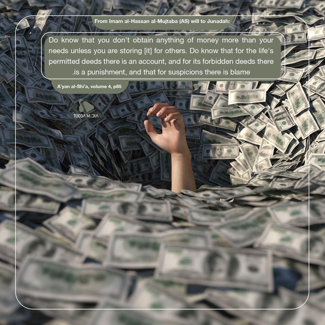 Imam Hassan (as) Do know that you don’t obtain anything of money more than your needs unless you are storing [it] for others. Do know that for the life’s permitted deeds there is an account, and for its forbidden deeds there is a punishment, and that for suspicious there is blame.