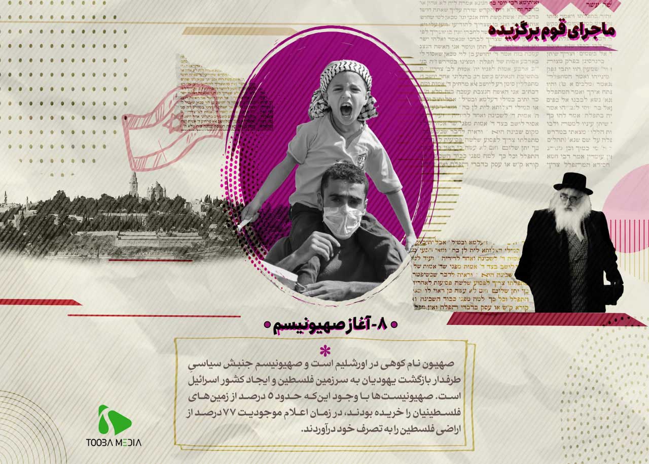 سیر نمایشگاهی قوم برگزیده ۸. آغاز صهیونیسم صهيون نام کوهی در اورشلیم است و صهیونیسم جنبش سیاسی طرفدا بازگشت یهودیان به سرزمین فلسطین و ایجاد کشور اسرائیل است. صهیونیست ها با وجود این که حدود ۵ درصد از زمین های فلسطینیان را خریده بودند، در زمان اعلان موجودیت ۷۷ درصد از أراضي فلسطین را به…