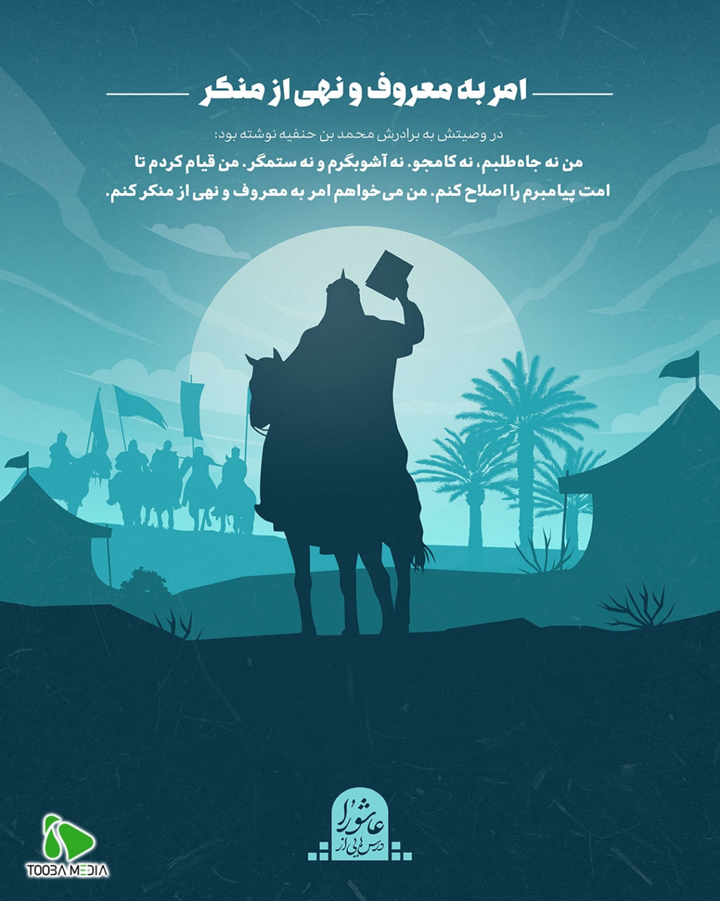 درس هایی از عاشورا امر به معروف و نهی از منکر در وصیتش به برادرش محمدبن حنفیه نوشته بود: من نه جاه طلبم، نه کامجو، نه آشوبگری و نه ستمگر، من قیام کردم تا امت پیامبرم را اصلاح کنم. من می خواهم امر به معروف و نهی از منکر کنم.